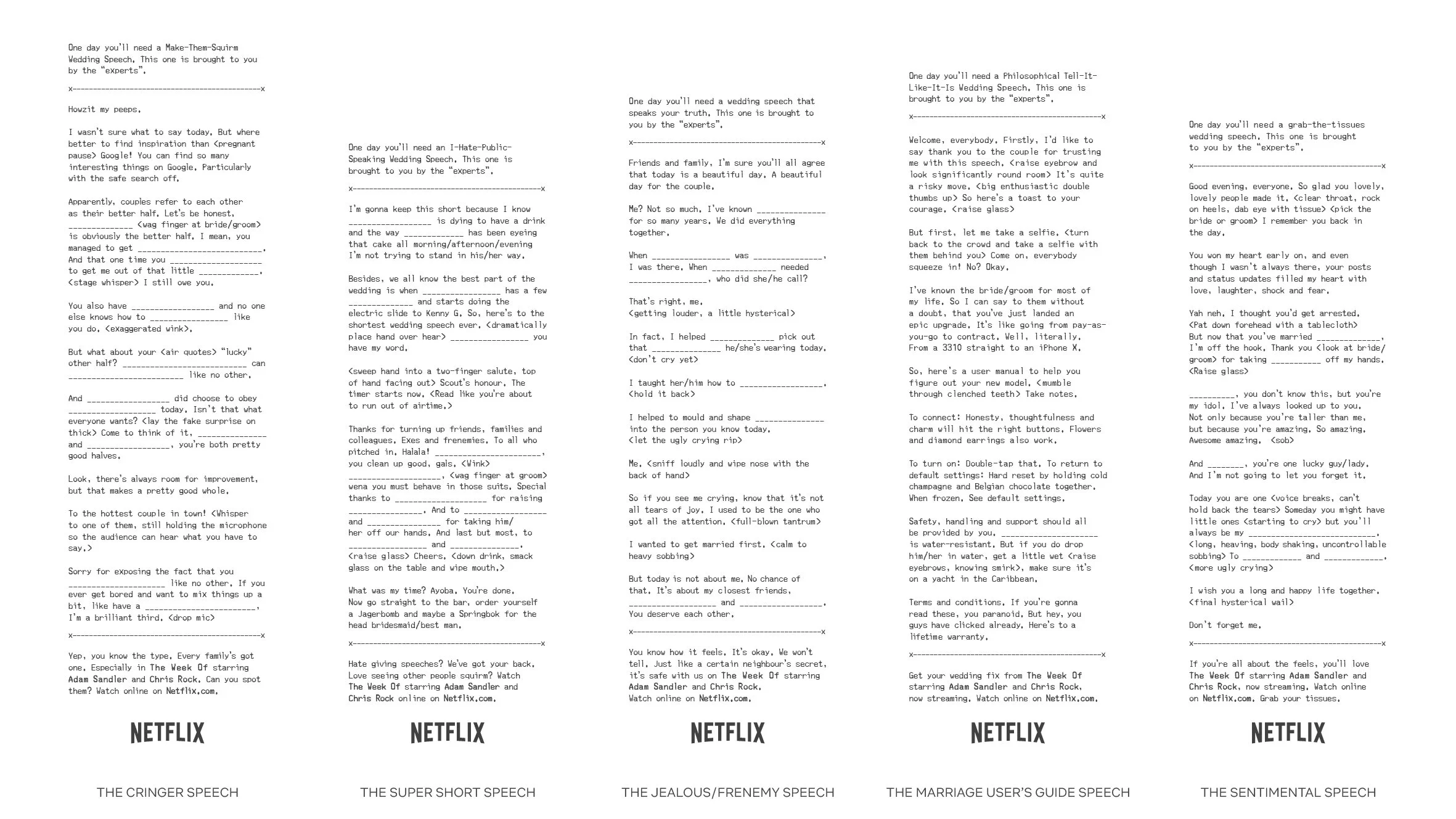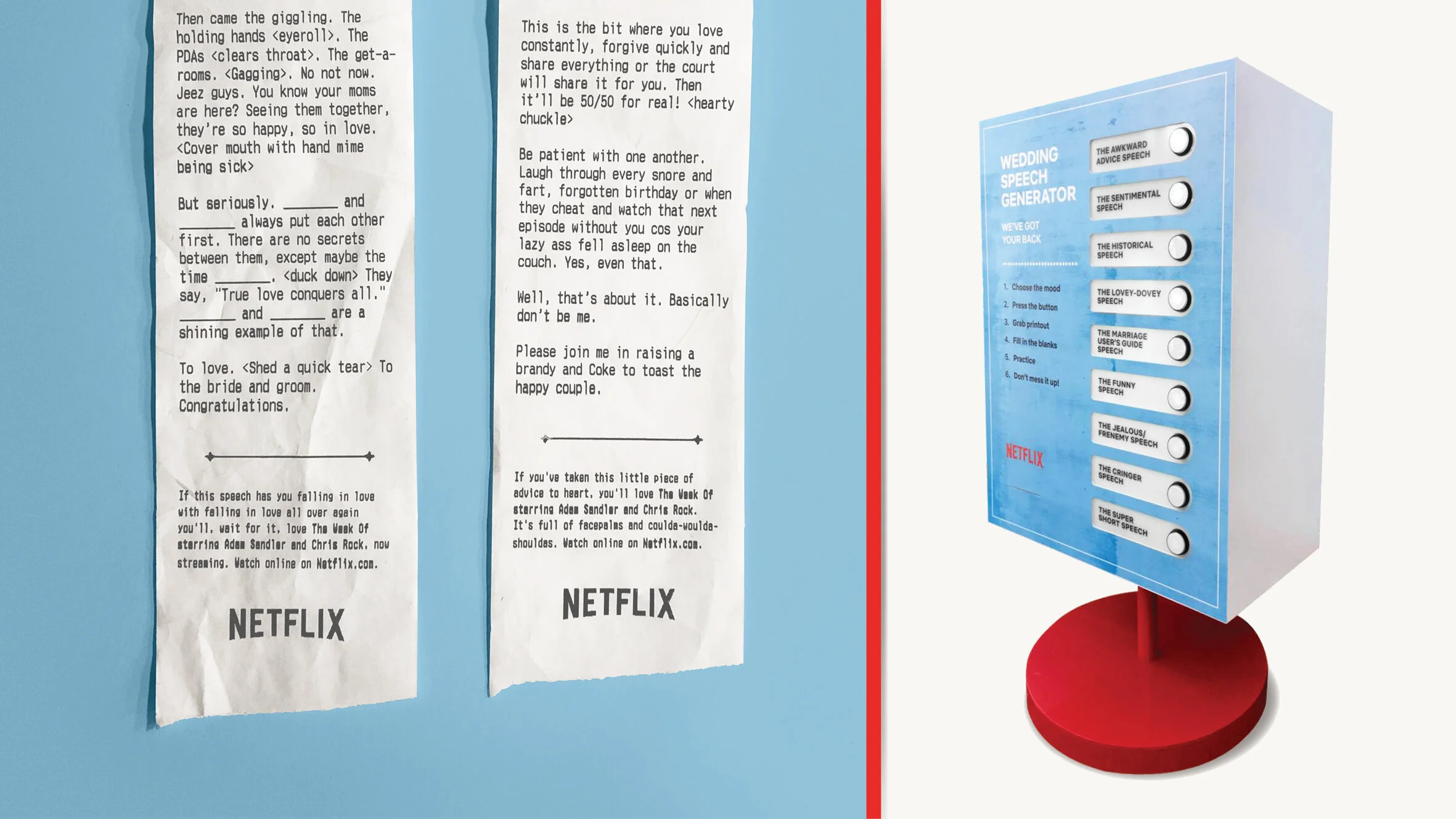 With so much to do in the final week of wedding prep, the speeches are at best, last-minute, and at worse, completely forgotten. So we built a Wedding Speech Generator, so anyone who needs a wedding speech has one less thing to think about. The speeches mirrored the comedic tone of “The Week Of” with a good dose of local flavour. We included director’s notes and blank spaces for a comedy-gold delivery so each speech could be personalised for the happy couple.